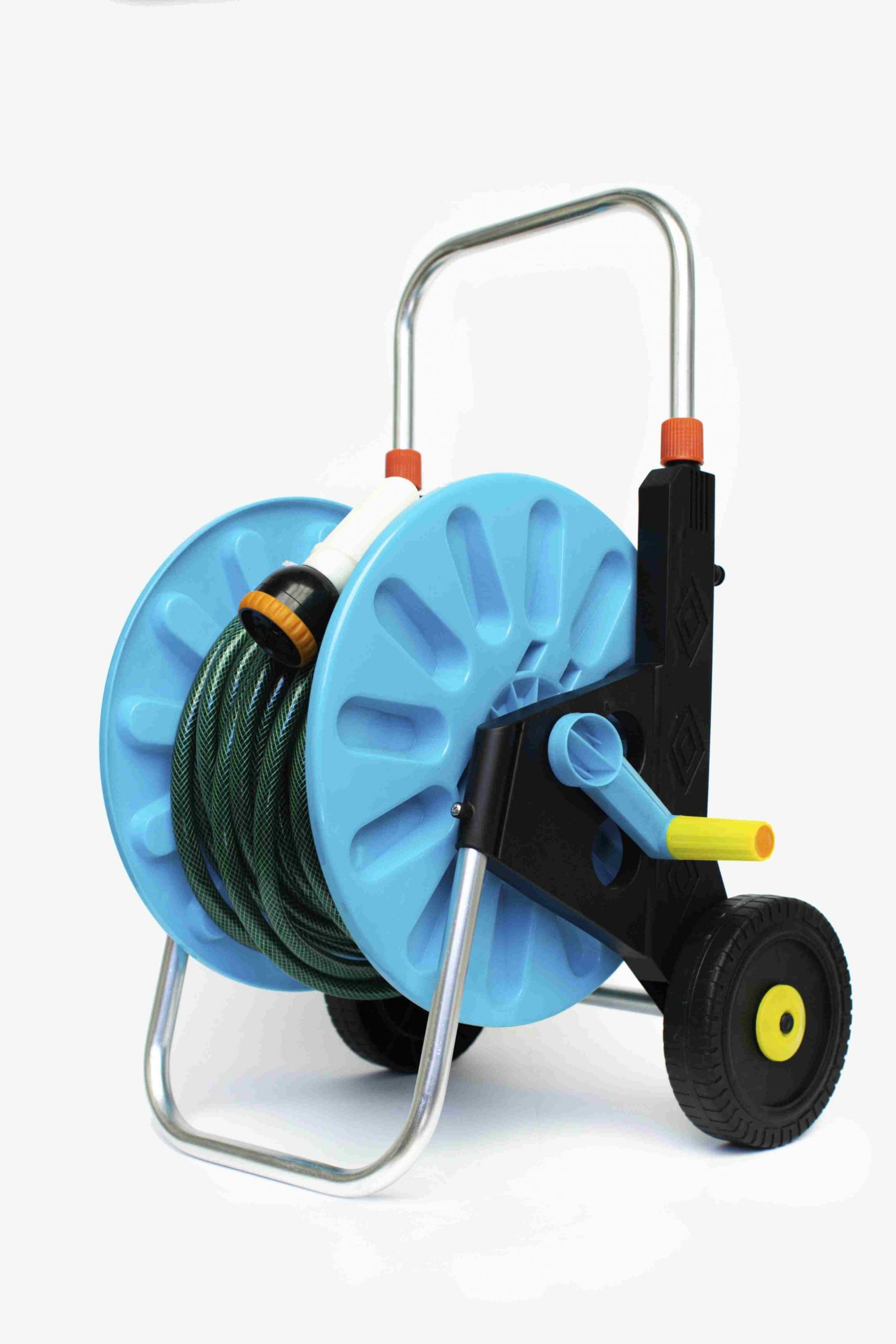 Práctico y resistente carrito enrollador ideal para mantener tu jardín ordenado y facilitar el riego. Incluye 20 metros de manguera de alta calidad y acoples listos para usar.